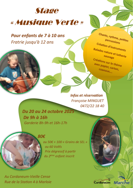 Le Cordaneum et Françoise Minguet propose un stage "Musique Verte", spécialement conçu pour éveiller les jeunes à la musique, tout en les reconnectant à la nature. Ce stage est une belle opportunité pour les enfants de découvrir l'univers musical à travers des ateliers ludiques et créatifs. 🎶